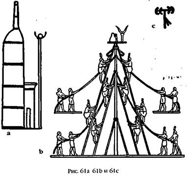 Загнутые устройства, видные на рис. 60б, напоминают египетские изображения инструментов для астрономических наблюдений, имевшихся в храмах. В Египте приборы для наблюдений состояли из круглой детали, помещенной между парой «рогов» на вершине высокого шеста (рис. 61а), и располагались перед храмами бога по имени Мин. Праздник в его честь проводился один раз в год во время летнего солнцестояния, и один из ритуалов состоял в том, что группа мужчин при помощи веревок ставила в вертикальное положение высокий шест – возможно, это был предшественник европейского майского дерева. На конце шеста поднималась эмблема Мина – храм с изображением лунного серпа (рис. 61б).