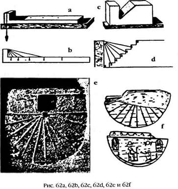 Простейшим астрономическим инструментом был гномон (от греческого «тот, кто знает»), который по отбрасываемой вертикальным шестом тени позволял следить за движением Солнца. Длина тени (она уменьшалась к полудню по мере подъема Солнца) указывала на время дня, а направление (первых и последних лучей Солнца на восходе и заходе) позволяло определить время года. Археологи обнаружили подобные устройства (рис. 62а) в Египте, причем они были размечены с целью определения времени (рис. 62б). Поскольку в периоды солнцестояний тень становилась слишком длинной, плоские устройства были усовершенствованы, и шкала приобрела наклон, что способствовало уменьшению длины тени (рис. 62с). Со временем это привело к изобретению ступенчатых солнечных часов, в которых время указывала тень, поднимавшаяся или спускавшаяся по ступеням лестницы (рис. 62d).