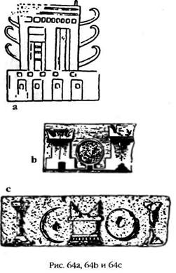 Согласно этому свидетельству две высокие башни храма были не просто архитектурными сооружениями, но служили для астрономических наблюдений. Вальтер Андреа, возглавлявший несколько наиболее успешных археологических экспедиций в Ассирии, высказывал мнение, что зубчатые венцы башен, стоявших по обе стороны ворот ассирийской столицы Ашшура, тоже служили этой цели («Die Jungeren Ishtar-Tempel»). Он нашел подтверждения своей гипотезе в рисунках ассирийских цилиндрических печатей, связывавших эти башни с небесными символами (рис. 59а и 59б). Андреа предположил, что некоторые из изображенных на рисунках алтарей (обычно вместе с исполняющим ритуалы жрецом) тоже имели отношение к астрономии. Их зубчатая верхняя часть (рис. 59с), а также расположение над воротами храма, на открытых площадках внутренних двориков, заменяли ступени зиккуратов – по мере того как сами зиккураты уступали место более простым в конструктивном отношении храмам с плоской крышей.