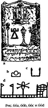 «Вотивная табличка», найденная на месте финикийского поселения на острове Сицилия (рис. 66а), изображает сцену на открытом воздухе, и поэтому объектом астрономических наблюдений, скорее всего, являлось движение Солнца, а не ночное небо. Перед сооружением с тремя колоннами располагаются столб с кольцом и алтарь. Здесь же находится и прибор для наблюдений: кольцо между двух коротких вертикальных опор, укрепленных на горизонтальной планке на треугольном основании. Это устройство для наблюдения за Солнцем напоминает египетский иероглиф, обозначающий «горизонт» – солнце, всходящее между двух гор (рис. 66b). И действительно, финикийский прибор (ученые называют его «культовым символом»), напоминающий пару поднятых рук, имеет отношение к египетскому иероглифу Ка (рис. 66с), который обозначал душу, или «второе я», фараона, совершающую после смерти путешествие в обитель богов на «планете (миллионов лет». О том, что происхождение иероглифа Ка связано с астрономическим прибором, свидетельствует древнее изображение (рис. 66d) устройства для наблюдения перед храмом.