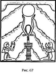 Все эти сходные черты и их астрономическое происхождение могут помочь в понимании египетских рисунков (рис. 67), изображающих путешествие Ка на планету богов – вытянутые руки напоминают шумерский прибор. Душа возносится в небо с вершины ступенчатой колонны.