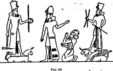 Согласно шумерскому «Списку царей» Энмедуранки был седьмым правителем до Великого потопа и правил в Сиппаре на протяжении шести орбитальных циклов Нибиру, прежде чем стал верховным жрецом и получил имя Энмедуранки. В «Книге Еноха» архангел Уриил открыл Еноху тайны Солнца (солнцестояния и равноденствия) и «законы Луны» и двенадцать созвездий. После окончания обучения Уриил дал Еноху – как Шамаш и Адад Энмедуранки – «небесные скрижали» и приказал внимательно изучить их и заметить «для себя все в отдельности». После возвращения на землю Енох передал полученные знания своему старшему сыну Мафусаилу. В «Книге тайн Еноха» перечисляются дарованные патриарху знания, включающие в себя «все небесные и земные дела: о море и всех явлениях, движениях и разгулах природных стихий; о Солнце, Луне, звездах, об их движении и изменении; о временах года, летах, днях и часах». Это соответствует атрибутам Шамаша – бога, небесным двойником которого было Солнце, и который руководил космопортом – а также Адада, древнего «бога погоды», управлявшего штормами и дождем. Шамаш (у шумеров Уту) обычно изображался с мерной рейкой и мерным шнуром в руках (рис. 54); Адад (у шумеров Ишкур), как правило, держал разветвленную молнию. Рисунок на печати одного из ассирийских царей (Тикулти-Нинутры I) изображает сцену представления царя двум великим богам – возможно, для того чтобы они одарили его знанием, которое когда-то было передано Энмедуранки (рис. 69).
