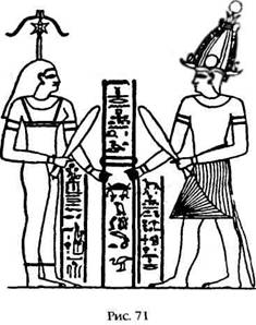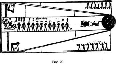 «Скажи, если знаешь. Кто положил меру ей, если знаешь? Или кто протягивал по ней вервь?» – спрашивал Господь Иова, предлагая признать, что хранителем тайн неба и земли является не человек, а Бог. В сцене представления царя-жреца богу Шамашу (рис. 54) смысл события передают фигуры двух Божественных держателей шнура. Два шнура, которые они протянули под углом к излучающей свет планете, предполагают не столько измерение расстояния, сколько ориентацию. На египетском рисунке с подобными мотивами, обнаруженном в папирусе царицы Нехмет, изображены два «держателя шнура», измеряющие угол планеты, названной «красным глазом Гора» (рис. 70).