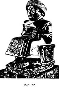 Это событие проливает свет на многие деяния богов и людей благодаря тому, что царь Лагаша Гудеа, на которого была возложена эта задача, подробно записал все происходящее на двух больших глиняных цилиндрах. Несмотря на грандиозность задачи, царь понял, что это великая честь для него, а также возможность увековечить свое имя и свои дела, выпадавшая лишь немногим правителям. И действительно, найденные археологами записи говорят, по крайней мере, об одном случае, когда великому царю (Нарамсину), любимцу богов, было несколько раз отказано в участии в строительстве нового храма (подобная ситуация повторилась тысячелетие спустя с царем Давидом в Иерусалиме). Гудеа искусно выразил свою благодарность богу, вырезав хвалебные надписи на собственных статуях (рис. 72), которые поместил в новом храме, и оставил огромное количество письменных свидетельств, которые объясняют, какими были святилища ануннаков и какой цели они служили.