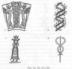 И действительно, символом Энки в Шумере считалась змея. В одной из предыдущих книг («Назад в будущее») мы высказали предположение, что в основу эмблемы из двух переплетенных змей (рис. 5а), сохранившейся до наших дней в виде эмблемы медицины, легла – в древнем Шумере! – структура двойной спирали ДНК (рис. 5б). Этот факт указывает на прямую связь с генной инженерией. Далее мы покажем, что генетические манипуляции Энки в Эдемском саду лежат в основе орнамента двойной спирали на изображениях древа жизни. Энки передал знания в области генетики и символ в виде переплетенных змей своему сыну Нингишзидду (рис. 5с), которого отождествляют с египетским богом Тотом; греки называют этого бога Гермесом, и его посох украшен эмблемой из переплетенных змей (рис. 5d).