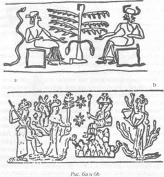 Неудивительно, что вторая встреча с богами, когда человеку была дарована способность к размножению, также запечатлена древними «фотографами» – художниками, которые вырезали зеркальные изображения на небольших каменных цилиндрах, так чтобы после прокатывания печати по сырой глине на ней оставался «позитив». Археологи нашли такие изображения в дополнение к рисункам, иллюстрирующим сотворение Адама. На одном из таких рисунков «Адам» и «Ева» сидят по обе стороны от дерева, а за спиной Евы располагается змей (рис. 6а). На другом изображении великий бог сидит на холме, напоминающем трон; из холма выползают две змеи. Вне всякого сомнения, это Энки (рис. 6б). Справа от него располагается мужчина, причем отходящие от него ветви имеют форму пениса, а слева женщина с ветвями в виде вагин; женщина держит в руках небольшое плодовое дерево (предположительно древо познания). За происходящим наблюдает грозный бог, – скорее всего, это разгневанный Энлиль.