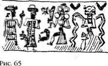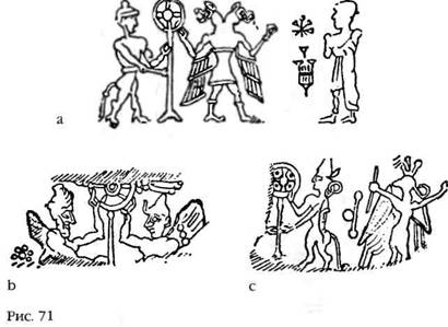 (Археологи обнаружили рисунки с изображением крылатых существ или людей-быков с круглыми устройствами на шестах, от которых исходили лучи. Вполне возможно, что именно их «мерцающий блеск повергает горы» – рис. 71а, б, с.)