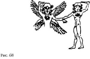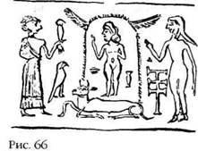 Рисунок на цилиндрической печати, иллюстрирующий эту сцену, изображает крылатого «посланника» (ангела), который ведет Энкиду, взяв его за руку (рис. 68).