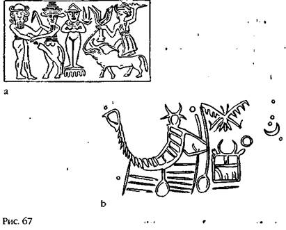 Древний текст не дает точного описания «небесного быка». Шумерский термин для его обозначения – ГУДАН.НА – может быть также интерпретирован как «атакующее оружие Ану», его «крылатая ракета». Древние художники, иллюстрировавшие этот эпизод, часто изображали сражение Энкиду и Гильгамеша с настоящим быком; за сражением обычно наблюдала обнаженная Иштар (иногда Адад). (Рис. 67а.) Однако из текста эпоса можно сделать вывод, что оружие Ану представляло собой механическое устройство из металла с двумя выступами («рогами») – «тридцать мин лазури их отливка, толщиною в два пальца их оправа». На некоторых древних рисунках изображен именно такой механический «бык», спускающийся с неба (рис. 67б).