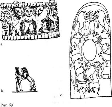 Ночью Гильгамешу приснился сон, который он воспринял как знамение от Сина, якобы предвещавшее «радости в жизни». Воодушевленный этим сном, Гильгамеш, «словно стрела», бросился на львов. Битва со львами увековечена в многочисленных рисунках, причем не только из Месопотамии, но и со всех древних земель, включая Египет (рис. 69а, б, с).