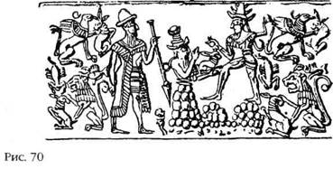 Выполняя указания Уршанаби, Гильгамеш прибыл в Итлу. Вдали действительно блестело море. В городе Гильгамеш подкрепился, совершил омовение и вновь стал похож на царя. Здесь Шамаш еще раз пришел ему на помощь, посоветовав принести жертву Уллу-Яху. Приведя Гильгамеша к великому богу (рис. 70), Шамаш попросил его принять жертву царя и «даровать ему жизнь». Однако ему возразил Кумарби – еще один бог, известный по хеттским мифам. Гильгамеш не может стать бессмертным, заявил он.