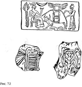 («Небесные Врата» – это весьма распространенный мотив изображений на ближневосточных цилиндрических печатях. Обычно они представляют собой крылатые, напоминающие лестницу ворота, ведущие к древу жизни. Иногда они охраняются змеями – рис. 72.)