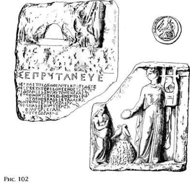 На дельфийских монетах был изображен Аполлон, сидящий на своем омфалосе (рис. 102), а после того, как греки покорили Финикию, появились изображения Аполлона на «ассирийском» омфалосе. Не менее часто каменный оракул изображался в виде двух конусов на общем основании – как на рис. 99.