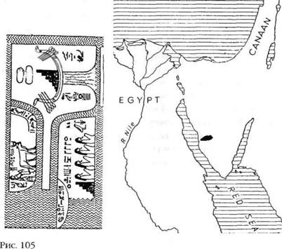 Месопотамские тексты указывали, что земля Тильмун располагалась в «устье» двух водных пространств. И действительно, Синайский полуостров, чья форма напоминает перевернутый треугольник, начинается в том месте, где Красное море разделяется на два залива – Суэцкий на западе и залив Эйлат (Акаба) на востоке. Египетские рисунки владений Сета, куда древние египтяне помещали подземное царство Дуат, представляли собой перевернутый Синайский полуостров со всеми его характерными географическими особенностями (рис. 105).