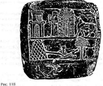 Где-то в запасниках Британского музея хранится глиняная табличка, найденная в Сиппаре, «культовом центре» Шамаша на территории Месопотамии. На ней бог изображен сидящим на троне под навесом, опора которого имеет форму финиковой пальмы (рис. 120). Другой бог представляет Шамашу царя и его сына. Перед сидящим богом на пьедестале установлена огромная эмблема испускающей лучи планеты. В надписи на табличке упоминаются бог Син (отец Шамаша), сам Шамаш и его сестра Иштар.