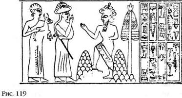 Археологами были найдены цилиндрические шумерские печати, на которых изображено явление бога пастуху. На них бог стоит между двух гор (рис. 119), а позади него видна напоминающая дерево ракета – возможно, это библейская «неопалимая купина». Две горные вершины в сцене с пастухом согласуются с таким часто встречающимся в Библии эпитетом бога, как Эль-Шаддади, то есть «бог двух вершин». Это позволяет выявить еще одно различие между двумя священными вершинами: одна представляла собой одиноко стоящую гору посреди пустынной равнины, а другая, по всей видимости, состояла из двух пиков.