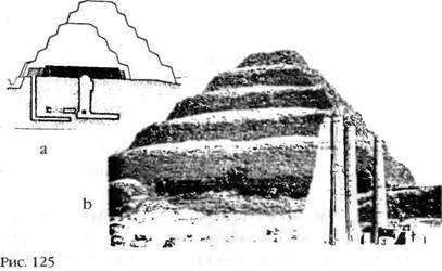 В учебниках написано, что первая из великих египетских пирамид была построена правителем Египта по имени Джосер, вторым фараоном Третьей Династии (приблизительно в 2650 году до нашей эры). Выбрав место к западу от Мемфиса на равнине, служившей некрополем (городом мертвых) этой древней столицы, он поручил блестящему ученому и архитектору Имхотепу построить гробницу, которая превзошла бы все известные ему усыпальницы. До этого времени тело умершего фараона помещали в склеп, выдолбленный в каменистой почве, а сверху накрывали гигантской горизонтальной могильной плитой, которая называлась «мастаба» и со временем все увеличивалась в размерах. Как утверждают некоторые исследователи, изобретательный Имхотеп положил на обычную мастаба на могиле Джосера несколько меньших по размеру плит, в результате чего получилась ступенчатая пирамида (рис. 125а). Рядом с ней внутри просторного двора были построены несколько зданий как функционального, так и декоративного характера – молельни, погребальные храмы, склады, дома для слуг и так далее; вся площадка была окружена высокой стеной. Пирамиду и развалины некоторых зданий (рис. 125b) можно и сегодня увидеть в Саккаре – полагают, что это место получило свое название по имени Сокара, «невидимого бога».