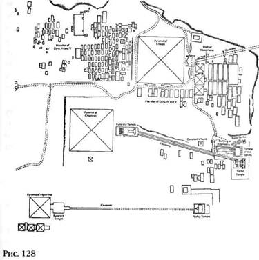 Снофру был отцом фараона Хуфу (которого греческие историки называли Хеопсом), и из этого следовал логический вывод, что сын принял эстафету от отца и построил следующую настоящую пирамиду, только еще большую по размерам – Великую пирамиду в Гизе. Ее царственная громада стоит там же, где и несколько тысяч лет назад, в компании двух других больших пирамид, приписываемых наследникам Хуфу, фараонам Хафре и Менкауру (Микерину). Три пирамиды стоят в окружении маленьких пирамид-спутников, храмов, надгробных плит, саркофагов и уникального Сфинкса. Несмотря на то что три пирамиды приписываются разным правителям, они, вне всякого сомнения, строились как единый комплекс (рис. 128) – это подтверждается не только ориентацией по сторонам света, но и взаимным расположением. Триангуляция этих трех памятников может быть распространена не только на весь Египет, но и на всю Землю. Впервые в современной истории это осознали инженеры Наполеона: они выбрали вершину Великой пирамиды в качестве фокальной точки, откуда производили топографическую съемку и составление карты всего Нижнего Египта.