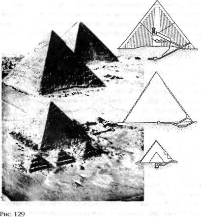 Некоторые исследователи (например, Курт Мендельсон, «The Riddle of Pyramids») предполагают, что Снофру одновременно строил другую пирамиду где-то к северу от Медума. После обрушения пирамиды в Медуме архитекторы поспешно изменили угол наклона граней уже наполовину построенной пирамиды. Меньший угол (43 градуса) обеспечил большую устойчивость, а также снизил высоту и вес всего сооружения. Это было мудрое решение, и свидетельством тому служит сам факт, что пирамида – получившая вполне подходящее название Скошенной пирамиды – стоит до сих пор (рис. 127).