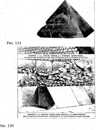 В настоящее время у пирамид Гизы также отсутствуют вершины, или так называемые замковые камни, которые имели пирамидальную форму и были изготовлены из блестящего металла или облицованы им – наподобие вершин обелисков. Остается только догадываться, кто, когда и зачем снял их с такой огромной высоты. Известно, правда, что в более поздние времена эти замковые камни, напоминающие бенбен из Гелиополя, вырезались из гранита и украшались специальными надписями. Один из них, венчавший пирамиду Аменемхета в Дашхуре, был обнаружен под слоем земли неподалеку от нее (рис. 131). На нем имелось изображение Крылатого Шара и надпись:
