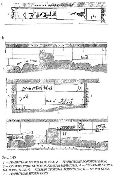 25 апреля при помощи пороха был пробит проход в помещение над камерой Веллингтона (Вайс назвал новую камеру в честь лорда Нельсона)– Она тоже оказалась пустой, а ее пол покрывала загадочная черная пыль. Вайс сообщил, что нашел «несколько отметок каменотесов, нанесенные красной краской на стены, особенно с западной стороны». Все это время мистер Хилл посещал вновь открытые помещения – якобы для того, чтобы написать в них (как?) имена Веллингтона и Нельсона. Двадцать седьмого апреля мистер Хилл – не Перринг и не Мэш – скопировал отметки. Надписи, обнаруженные в камере Нельсона (но не Веллингтона), Вайс приводит в своей книге (рис. 145а).