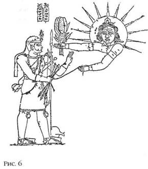 Кем же был этот завоеватель «Киш» – то есть правитель страны Куш, или Нубии? В греческой версии легенды завоеватель, который сумел пересечь это озеро – оно описывается как часть Красного моря, – носил имя Sesonchusis Таким образом, Sesonchusis и Киш – это одно и то же лицо – фараон, под властью которого находились и Египет, и Нубия. На нубийских памятниках изображен царь, которому «Сияющий Бог» вручает «плод жизни», похожий на плод финиковой пальмы (рис. 6).