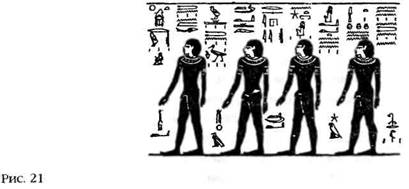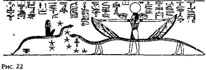 Ими руководит бог с эмблемой солнечного диска на голове, который стоит, раскинув руки, между крыльями змеи с четырьмя человеческими ногами. На усыпанном звездами фоне перед богом и змеей располагается еще одна змея, на этот раз бескрылая, уносящая в небо сидящего на ней Осириса (рис. 22).