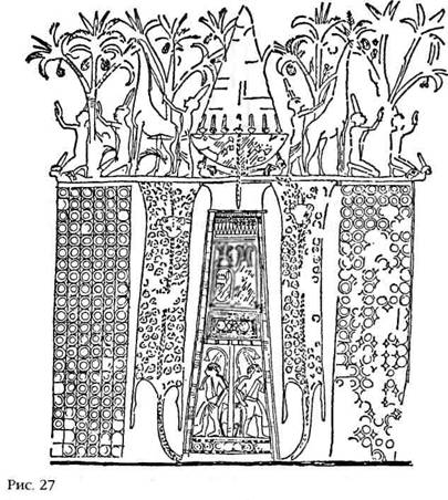 (Рисунок в гробнице Рамсеса IX дает основание предположить, что створки Двойных Дверей были наклонными; они открывались при помощи блоков и шкивов, которыми управляли по шесть богов у каждой створки. Затем через похожее на воронку отверстие вверх мог подняться гигантский человекоподобный сокол (рис. 25).