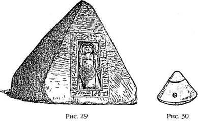 Египетские историки рассказывают, что святыня в Гелиополе несколько раз разрушалась иноземными захватчиками. До настоящих дней от нее не сохранилось даже руин. Сам бенбен тоже исчез. Однако на египетских памятниках он изображался в виде конусообразной кабины, внутри которой располагался бог. Археологи даже нашли каменную масштабную модель бенбена, на которой ясно виден открытый люк и приглашающий жест бога (рис. 29). Истинная форма Небесной палаты, по всей видимости, точно передана на известном рисунке из гробницы вельможи (рис. 27). Современные командные модули – капсулы с астронавтами, расположенные в верхней части ракеты при старте и возвращающиеся на землю (рис. 30), – очень похожи на бенбен, что, вне всякого сомнения, является результатом сходства в их назначении и функциях.