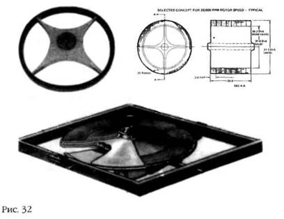 Маховики, как правило, изготавливались с тяжелым ободом, поскольку энергия лучше накапливается во внешней части колеса. Однако в 70-х годах инженеры корпорации «Lockheed» придумали альтернативную конструкцию – с легким ободом, которая, по их мнению, лучше подходила для экономии энергии в тяжелых грузовых локомотивах и для аккумулирования энергии в троллейбусах. Исследования продолжили специалисты «Airesearch Manufacturing Company»; разработанная ими – но так и не внедренная в производство – модель представляла собой маховик, заключенный в герметичном корпусе, заполненном маслом. Сам факт, что их необычный маховик (рис. 32) был очень похож на 5000-летний предмет из египетской гробницы, не менее удивителен, чем то, что совершенный предмет из 3100 года до нашей эры выглядит точно так же, как разработка инженеров аэрокосмической отрасли в 1978 году нашей эры.