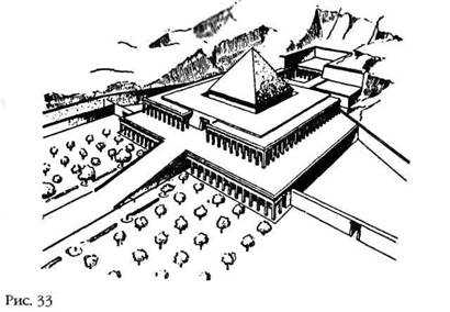 Когда в эпоху правления Одиннадцатой Династии в Египте был восстановлен порядок, новой столицей государства стали Фивы, а верховным божеством – Амон. Фараон Ментухотеп (Неб-Непет-Ра) построил неподалеку от Фив огромный храм Ра, верхняя часть которого представляла собой «пирамиду» и была предназначена для увековечения Небесных палат Ра (рис. 33).