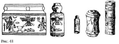 Бывший в свое время столицей царства город Аккад археологи обнаружили к югу от Вавилона, а древний город Киш был найден к юго-востоку от Аккада. Чем дальше археологи продвигались по равнине между двух рек в юго-восточном направлении, тем старше становился возраст находок. В местечке под названием Варка был обнаружен город Урук, победой над которым похвалялся Саргон – библейский Эрех. С его открытием исследователи шагнули из третьего в четвертое тысячелетие до нашей эры. Здесь нашли первую расписную керамику, обожженную в печи, и самые древние свидетельства использования гончарного круга. К тому же периоду относятся вымощенные известняковыми плитами улицы города, которые на данный момент являются самыми старыми из известных нам каменных сооружений. В Уруке археологи обнаружили также первый зиккурат – огромную рукотворную гору, на вершине которой располагались два храма, красный и белый. Здесь же были найдены и первые памятники письменности (рис. 40), и первые цилиндрические печати (рис. 41), оставлявшие четкий рисунок на пластинках сырой глины.