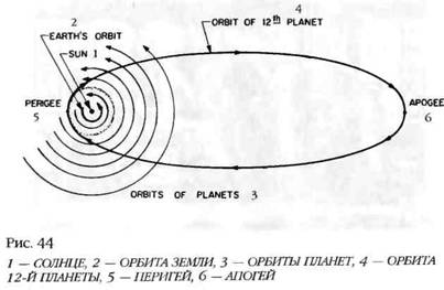 Сам Мардук уцелел, но стал вращаться вокруг Солнца по вытянутой эллиптической орбите, возвращаясь к месту «небесной битвы» между Юпитером и Марсом один раз в 3600 земных лет (рис. 44). Так образовались двенадцать небесных тел Солнечной системы – Солнце, Луна (шумеры считали ее полноценным небесным телом), девять известных нам планет и одна неизвестная, двенадцатая планета Мардук.