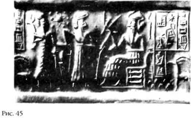 Древние шумеры считали Солнце центром Солнечной системы и знали о существовании всех входящих в нее планет, включая внешние планеты – Уран, Нептун и Плутон, – которые современная астрономия открыла совсем недавно и которые нельзя увидеть невооруженным глазом. Во все посвященные планетам тексты, списки и рисунки шу меры обязательно включали еще одну планету – НИБИРУ, Мардук, – при сближении с Землей проходившую между Марсом и Юпитером, как показано на цилиндрической печати, возраст которой оценивается в 4500 лет (рис. 45).