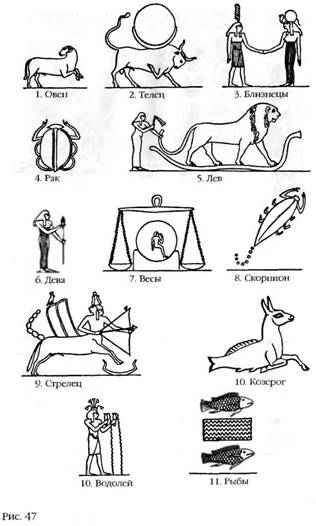 Важное место в астрономии занимали созвездия, лежавшие в плоскости орбит, по которым планеты вращаются вокруг Солнца. Шумеры называли их УЛ.ХЕ («сияющее стадо») – греки трансформировали это название в «зодиакос киклос» («круг животных»), а мы продолжаем называть Зодиаком – и делили на двенадцать групп, образующих двенадцать домов Зодиака. За прошедшие тысячелетия остались неизменными не только шумерские названия этих групп – Телец, Близнецы, Рак, Лев и так далее, – но даже их изображения (рис. 46). Египетский Зодиак, появившийся гораздо позже, был почти идентичен шумерскому (рис. 47).