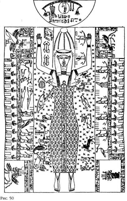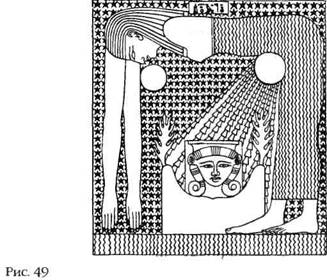 На хорошо сохранившейся карте, обнаруженной в 1857 году Г. К. Бругшем в одной из гробниц Фив (рис. 50), изображена богиня Нут («Небо») в окружении двенадцати зодиакальных созвездий. Это изображение размещено на центральной панели над саркофагом. По обе стороны саркофага внизу проиллюстрированы двенадцать часов дня и ночи. Следом идут изображения планет – небесных богов – которые двигаются по предписанным орбитам в своих небесных ладьях (шумеры называли эти орбиты «судьбами» планет).