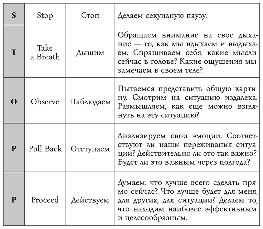 Еще одна простая методика, помогающая стабилизировать психическое состояние, называется STOPP. Она включает в себя аспекты когнитивной поведенческой терапии и медитацию осознанности.