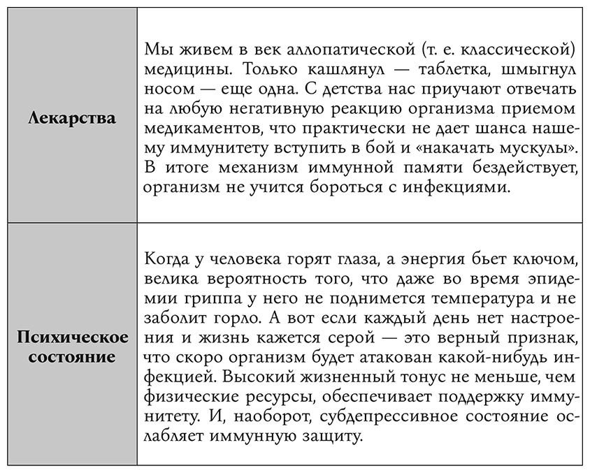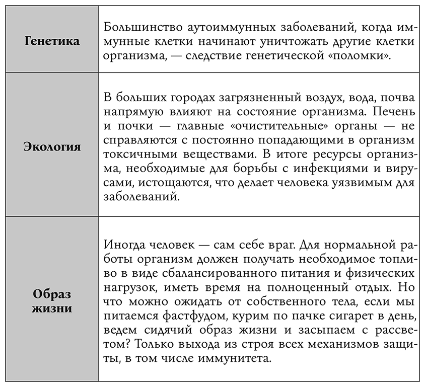 Конечно, наличие одной иммунной системы не гарантирует нам здоровья и долголетия, хотя оно и необходимо для выживания организма. Существует еще множество факторов, которые помогают работе нашего иммунитета или, наоборот, ослабляют нашу защиту.