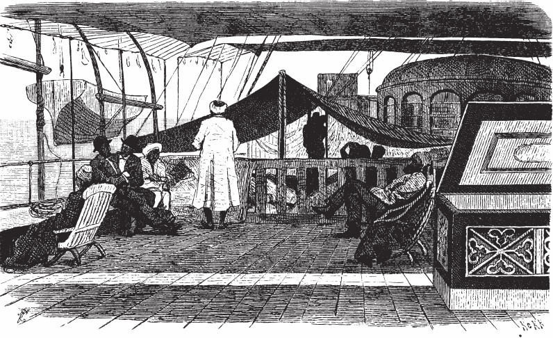 Время тянулось томительно однообразно, чему, как мне кажется, немало способствовало безоблачное небо, спокойный вид моря и равномерный стук машины. К тому же большая часть пассажиров, чрезвычайно типичных мусульман, вовсе не расположены были поддерживать чье бы то ни было оживление: они сидели на своих местах, как манекены, и всецело погружались либо в чтение своих молитвенников, либо предавались, чисто по-восточному, своему бесконечному курению, прихлебывая из крошечных чашечек черную кофейную гущу. По временам их позы изменялись только для молитвы, совершаемой, кажется, семь раз в течение дня, и затем все эти правоверные возвращались к своему неподвижному покою.