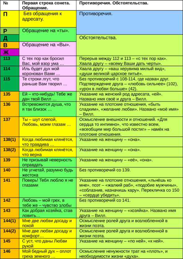 Р – родственник, Д – друг, В – возлюбленная, Ж – жена, П – поэт (без обращения к адресату). Цвет адресата в колонке номера сонета.