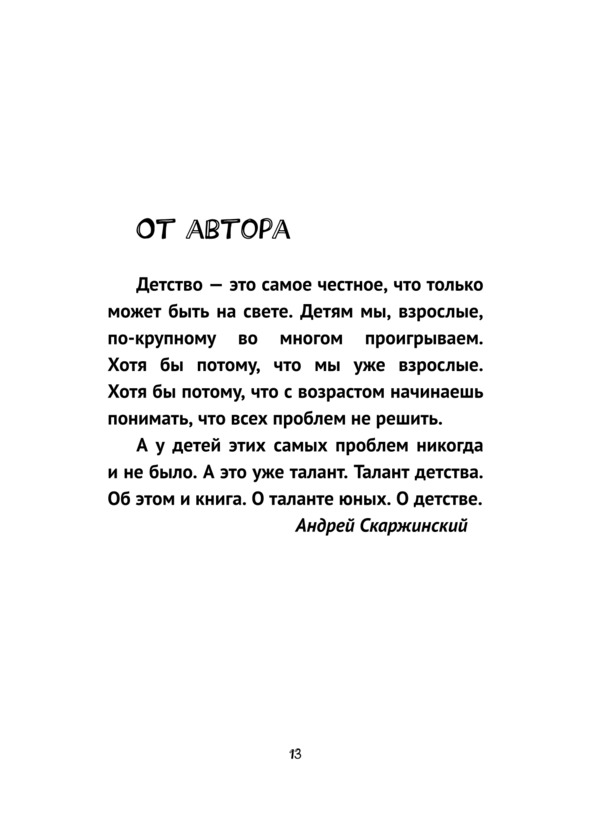 Если вам иногда грустно и кажется, что не все ваши способности раскрылись, и хочется найти причину, откройте эту книжку и погрузитесь в… собственное детство. Читая, наверняка вы вспомните и собственные грандиозные планы, и сногсшибательные открытия, задумаетесь о том, что из всего этого дошло до вашей взрослой жизни, а если не дошло, то почему. И вам станет легче. Ведь нам бывает грустно не от того, что что-то не получилось или не получается, а от вопроса: а было ли во мне что-то вообще? Игорёк, герой всех рассказов Андрея Скаржинского, на этот вопрос всегда готов ответить: «Конечно, есть, иначе и быть не может!»