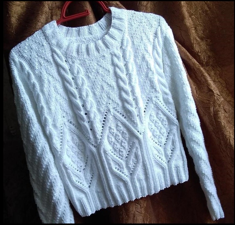 Оригинальный, стильный свитер с крупным узором внизу. Модель получилась спонтанно и оказалась очень гармоничной (Фото 1 – 3). Пыталась что-то изменить, чтобы адаптировать под разные размеры, но получившиеся варианты не понравились. Получить разные размеры можно за счёт небольших гладких участков по бокам, расширяя их по мере увеличения размера, что делается во многих моделях. Также увеличить размер можно за счёт использования более толстой пряжи. Кстати, изделия из толстой пряжи всегда выглядят стильно и эффектно.