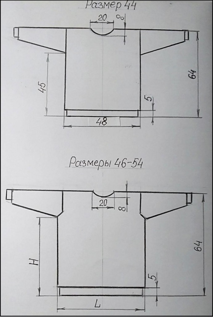 Эту модель можно вязать разной длины, какая Вам нравится. За основу берём длину 64см. Основные размеры в Таблице 1. Построение конструкции для разных размеров представлено на Рисунке 1.