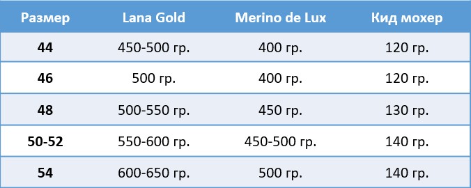 Расход пряжи приведен в Таблице 2, спицы 4 мм, 3,5мм. Плотность 17 петель и 25 рядов = 10 х 10 см.