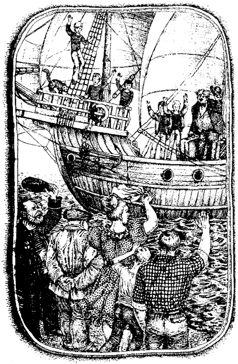По команде Арбузика стали поднимать якоря, крутя ворот. Пожарники заиграли прощальный марш. Главный пожарник надел каску и отдал честь.