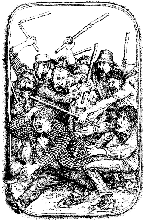 Откуда ни возьмись появились люди с палками. Они окружили Эпельсинова, о чем-то возбужденно переговариваясь, а потом накинулись на него и принялись колотить палками. Вырвавшись, Эпельсинов дал такого стрекача, что Бебешка не успел даже окликнуть его.