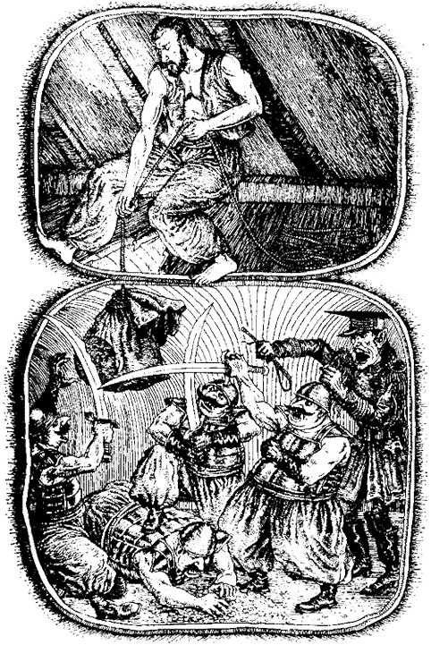 Спустившись, он попытался обвязать бочонок веревкой, но круглый бочонок то и дело выскальзывал из петли.