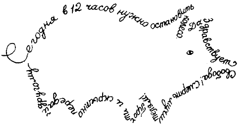 Ночью, когда все в тюрьме спали и надсмотрщики, отойдя от камер, дремали на стульях или играли друг с другом в щелчки, Бебешка спичечным угольком написал записку. На первый взгляд это был рисунок обыкновенной хрюшки. Но кто пригляделся бы повнимательнее, прочел бы очень важное сообщение.