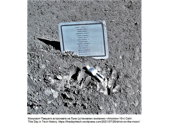Немного позже, 26 июля 1971 года к Луне отправились астронавты Дэвид Скотт, Альфред Уорден и Джеймс Ирвин на корабле «Аполлон-15». Во время выполнения программы исследований, 1 августа 1971 года в районе Хэдли-Аппенины (юго-восточная окраина Моря Дождей, район прилунения «Аполлона-15), астронавты установили мемориальный памятник «Павшего астронавта» (миниатюрная 8,5 см алюминиевая фигурка космонавта в скафандре, лежащего навзничь, автор Пол ван Хэйдонк) и табличку, на которой были выгравированы имена погибших и умерших 8 американских астронавтов и 6 советских космонавтов за всю историю освоения космического пространства. Помимо Юрия Гагарина, Владимира Комарова и Павла Беляева на табличке увековечены имена Георгия Добровольского, Владислава Волкова и Виктора Пацаева.