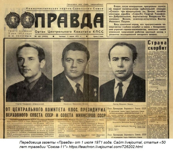 А 30 июня 1971 года мир потрясла новая космическая трагедия – при возвращении с орбиты из-за разгерметизации спускаемого аппарата погиб экипаж советского корабля «Союз-11» в составе Георгия Добровольского, Владислава Волкова и Виктора Пацаева. В адрес советского руководства и семей героев шли соболезнования от руководства стран (в первую очередь социалистического лагеря, Западной Европы, США) и простых граждан со всего мира.